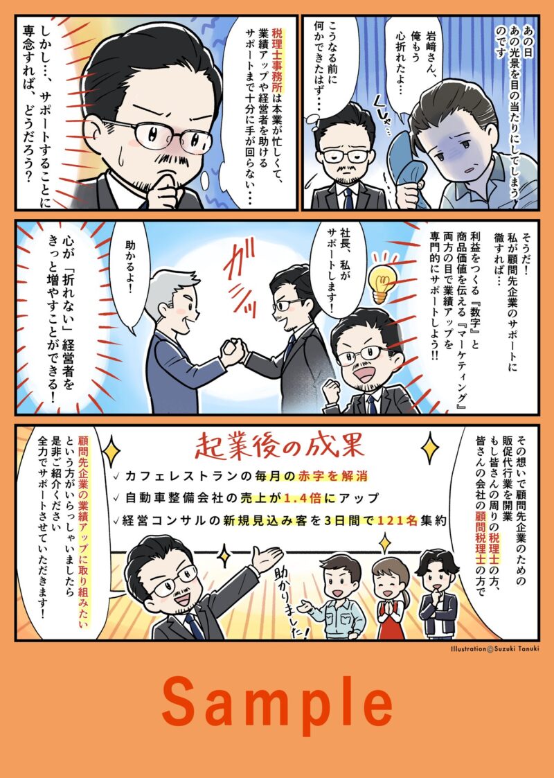 見込み顧客先へ配布するチラシに掲載するための「自己紹介・事業紹介」マンガを描かせていただきました。